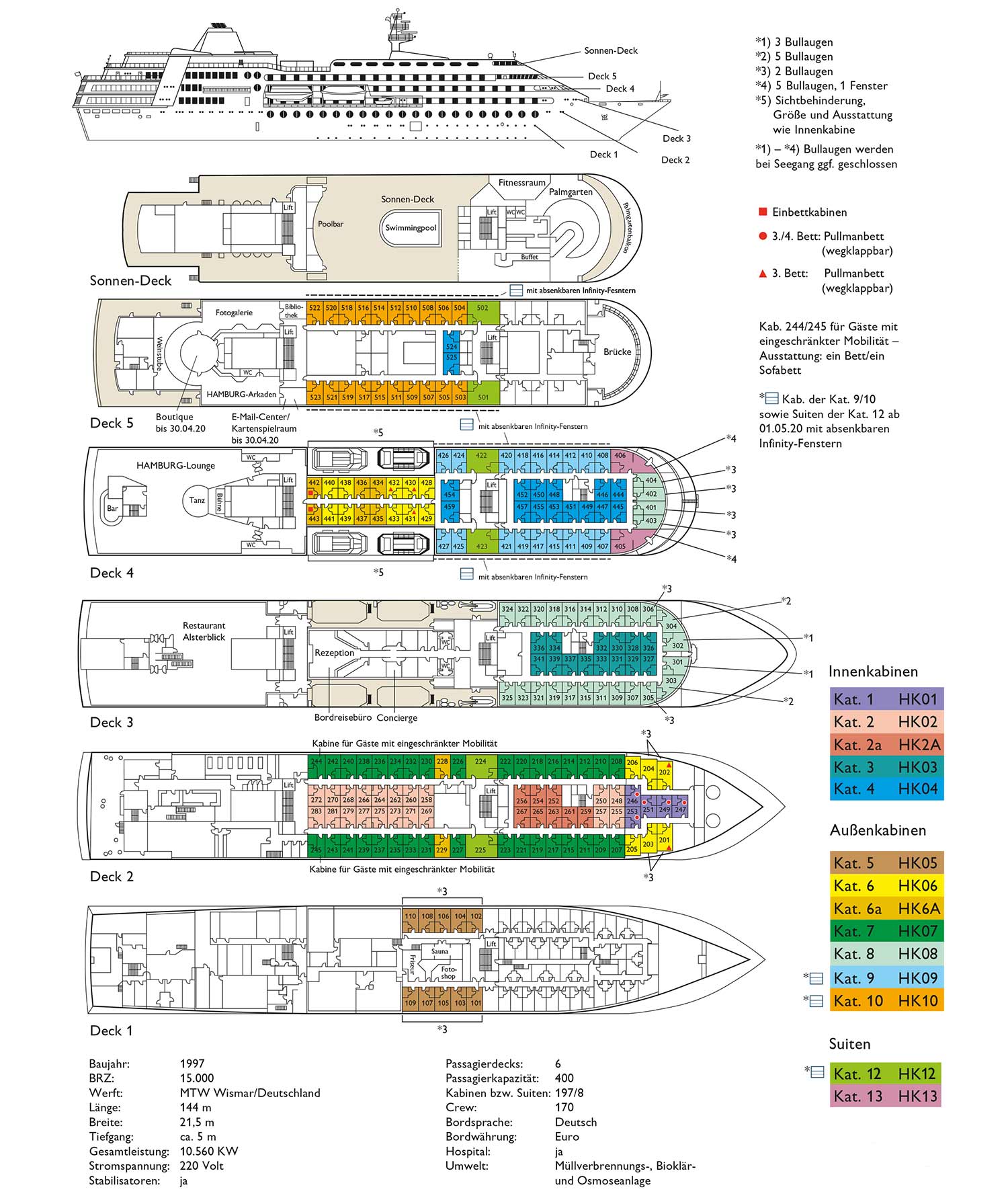 - 197 Kabinen, davon 63 Innenkabinen, 134 Außenkabinen
